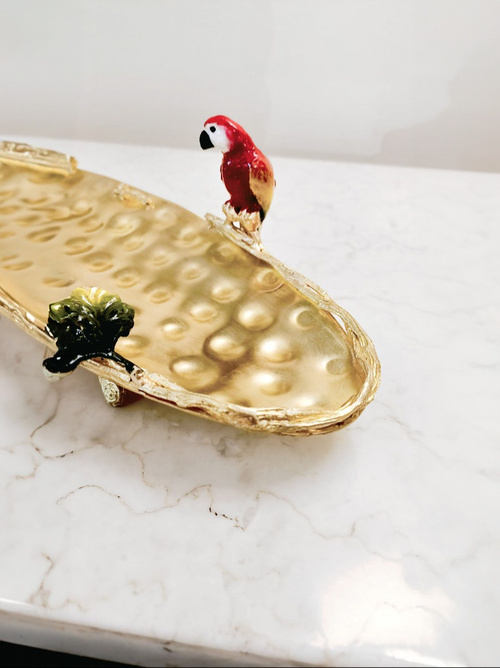 ترکیبی هنرمندانه از طبیعت و تجمل در رولت خوری بیضی «طوطی». سطح داخلی این دیس با ظرافت تمام چکش‌کاری شده که بازتابی درخشان و لوکس از نور ایجاد می‌کند.