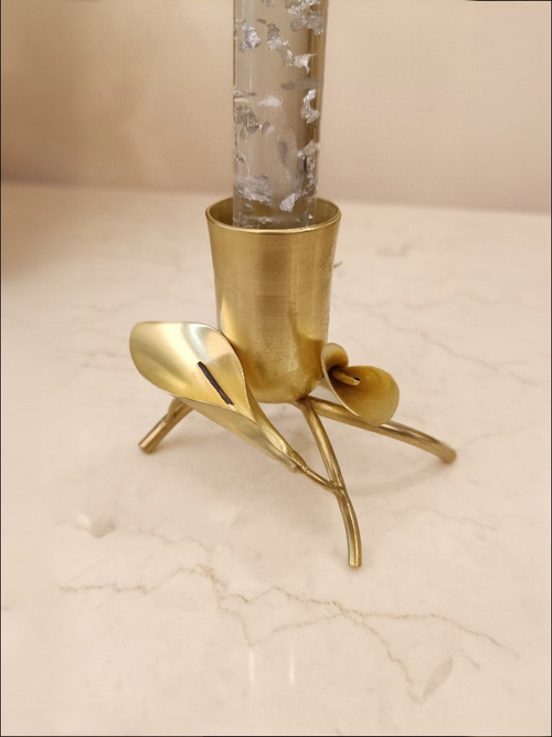 این اثر، با درخشش گرم و اصیل برنج (رنگ طلایی)، زیبایی‌شناسی مینیمال را با الهام از طبیعت ترکیب کرده است. فرم سیال و زنده‌ی آن، در تضادی زیبا با خطوط صاف شمع (به‌ویژه شمع‌های کریستالی و کشیده) قرار می‌گیرد.