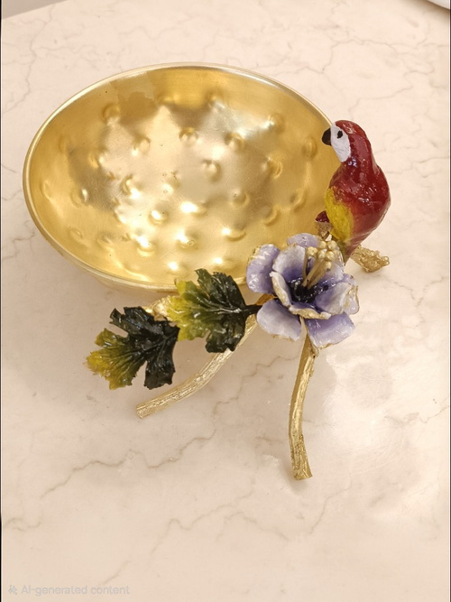 این کاسه برنجی دکوری با طراحی هنرمندانه‌ی پرنده و گل، اثری از سلیقه و ظرافت در مجموعه گالری سیم است. سطح طلایی براق آن در کنار لعاب میناکاری رنگی، انرژی و لطافت خاصی به فضا می‌دهد.