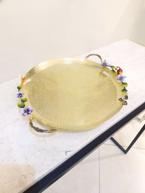 از طرفی، ویژگی بارز و متمایز این محصول، سایز و هندسه آن است. فرم دایره بزرگ این سینی به گونهای طراحی شده که فضای کافی برای چیدمان آزادانه ظروف را فراهم میکند و دسترسی به محتویات آن از هر طرف آسان است. بدین ترتیب، وقتی شما به این سینی دایره دکوراتیو بزرگ برنجی نگاه میکنید، سطح وسیع و چکشکاری شده آن را میبینید که با هزاران ضربه چکش دست هنرمندان تزیین شده و نور را با درخششی خیرهکننده بازتاب میدهد. علاوه بر این، در دو طرف سینی، دستههایی محکم و زیبا تعبیه شده که با گلهای برجسته و طوطیهای رنگارنگ تزیین شدهاند. همچنین، این تزیینات رنگی در تقابل با سطح طلایی و بزرگ سینی، جلوهای از باغهای بهشتی را تداعی میکنند. در نتیجه، این محصول تلفیقی از قدرت (ابعاد بزرگ) و لطافت میناکاری است.